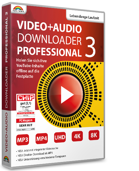 Mit Video & Musik Downloader PRO 3 laden Sie Videos bis 8K und Musik von YouTube (inkl. Playlists) und Mediatheken einfach herunter, konvertieren sie in MP3/MP4 und genießen sie offline auf jedem Gerät.